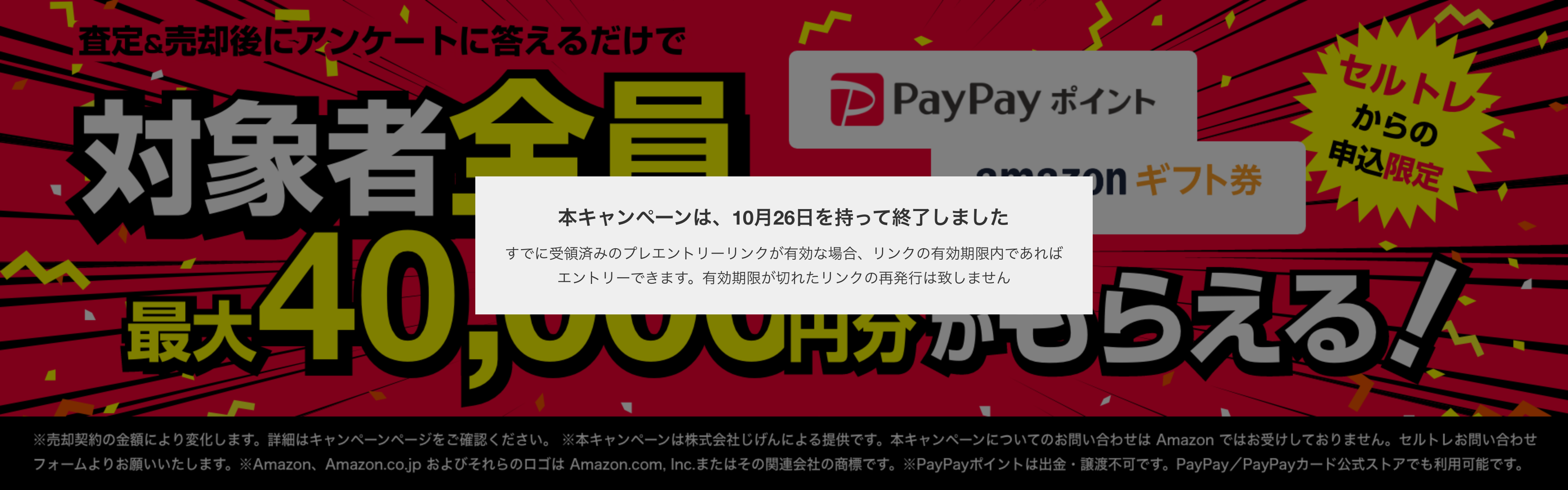 | 応募対象除外事項・応募の無効等 | 以下の内容に該当すると弊社が判断した場合、応募対象除外となります。 ・セルトレのウェブサイトページではなく、電話・メール等による査定依頼 ・応募時の提出書類の不備や、提出画像から文字が確認できない場合 ・査定依頼した車の表記が、応募時に添付された書類画像で確認できない場合 以下の内容に該当すると弊社が判断した場合、本キャンペーンの応募は無効となります ・プレエントリーまたは本エントリーについて指定された期日を過ぎた応募 ・応募時に入力されたアンケート及び感想・口コミの内容が、適切な形式かつ事実に則して記載されたものでないと弊社が判断する場合 ・プレエントリーまたは本エントリー時に入力された情報にもとづきメールその他の方法により連絡を行い、連絡後7日以内に応答が無い場合、または、誤情報などの理由により連絡手段が無い場合 ・当サイトを利用せずに車買取業者と連絡をとった後、当サイトから再度査定依頼を行い、本キャンペーンに応募した場合 ・セルトレを通じた査定依頼日が、車両売却日当日、または、車両売却後の場合 ・法令・条例に違反する行為、公序良俗に反する行為、犯罪行為または不正行為に結びつく行為を行なった場合 ・その他弊社が不正・不適切と判断する行為を行なった場合 | ||||||||