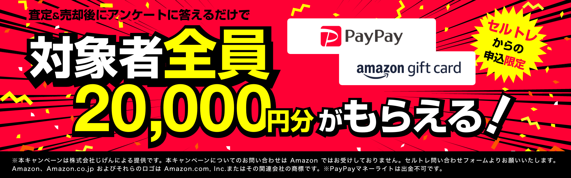 セルトレのウェブサイトから売却・買取査定依頼を行なった方の内、応募条件を満たした方へ、お祝いとお礼を兼ねて、AmazonギフトカードやPayPayマネーライトなどお好きなギフト券と交換のできる20,000円分(※下記詳細参照)のデジタルギフト券をプレゼントするキャンペーンです。